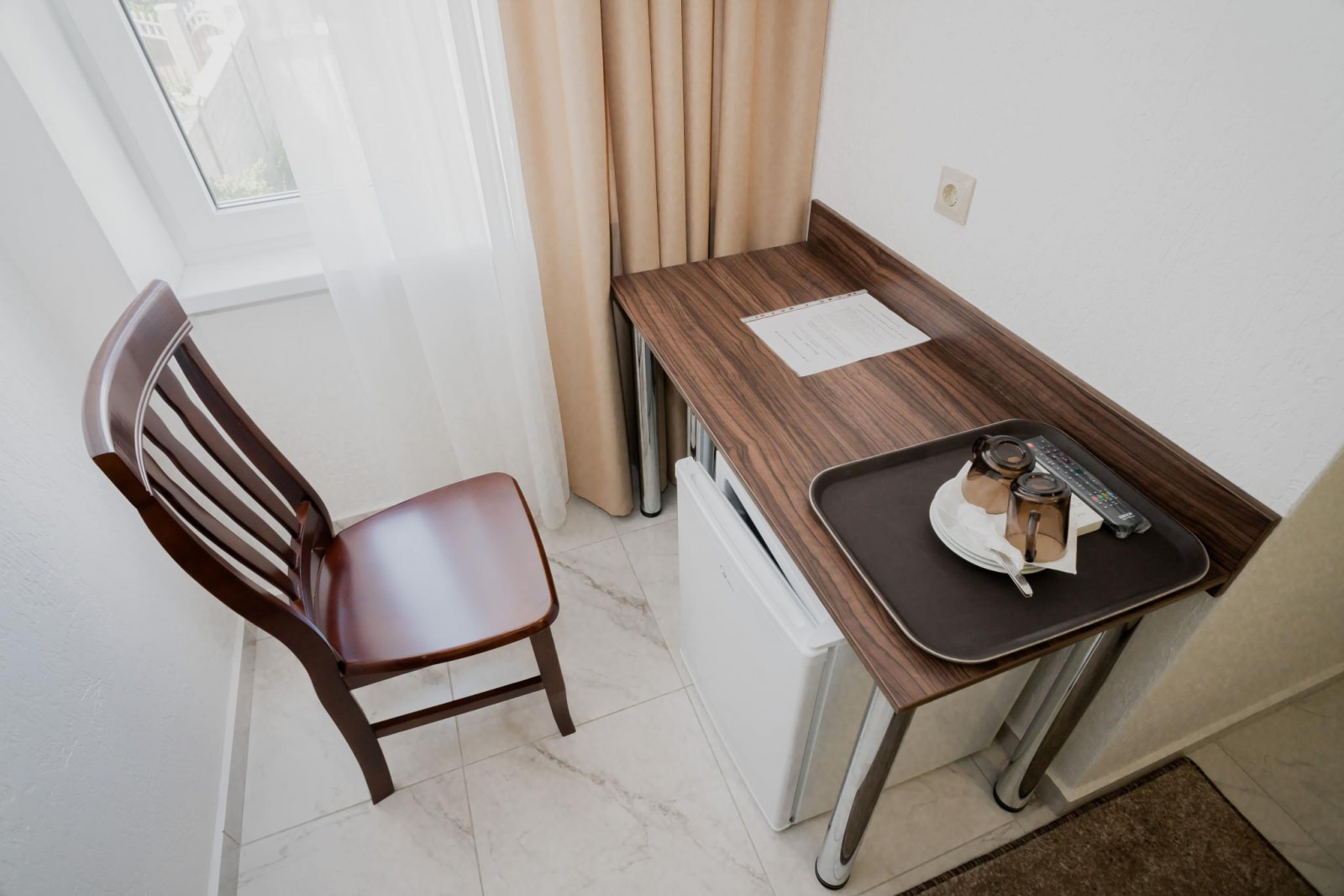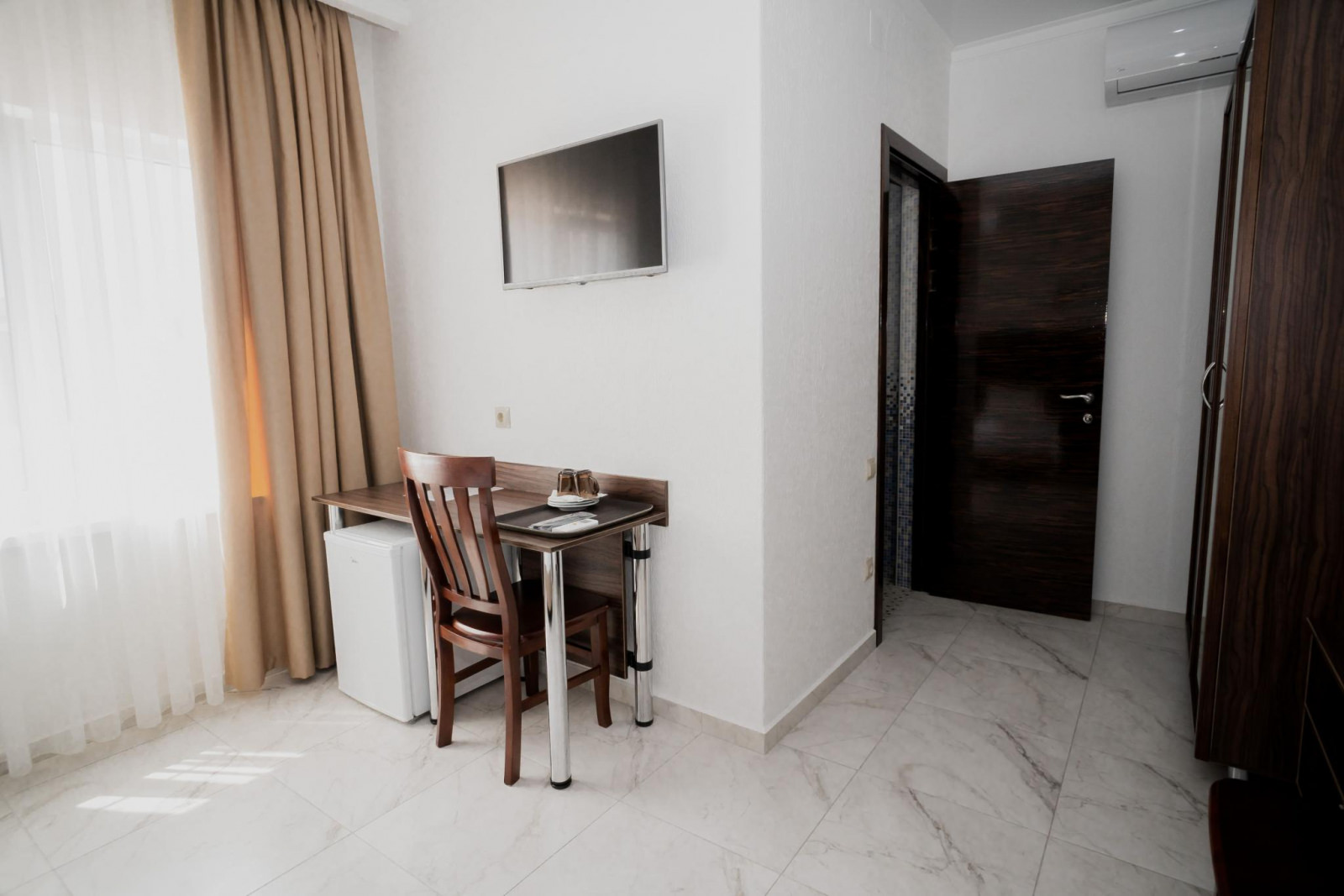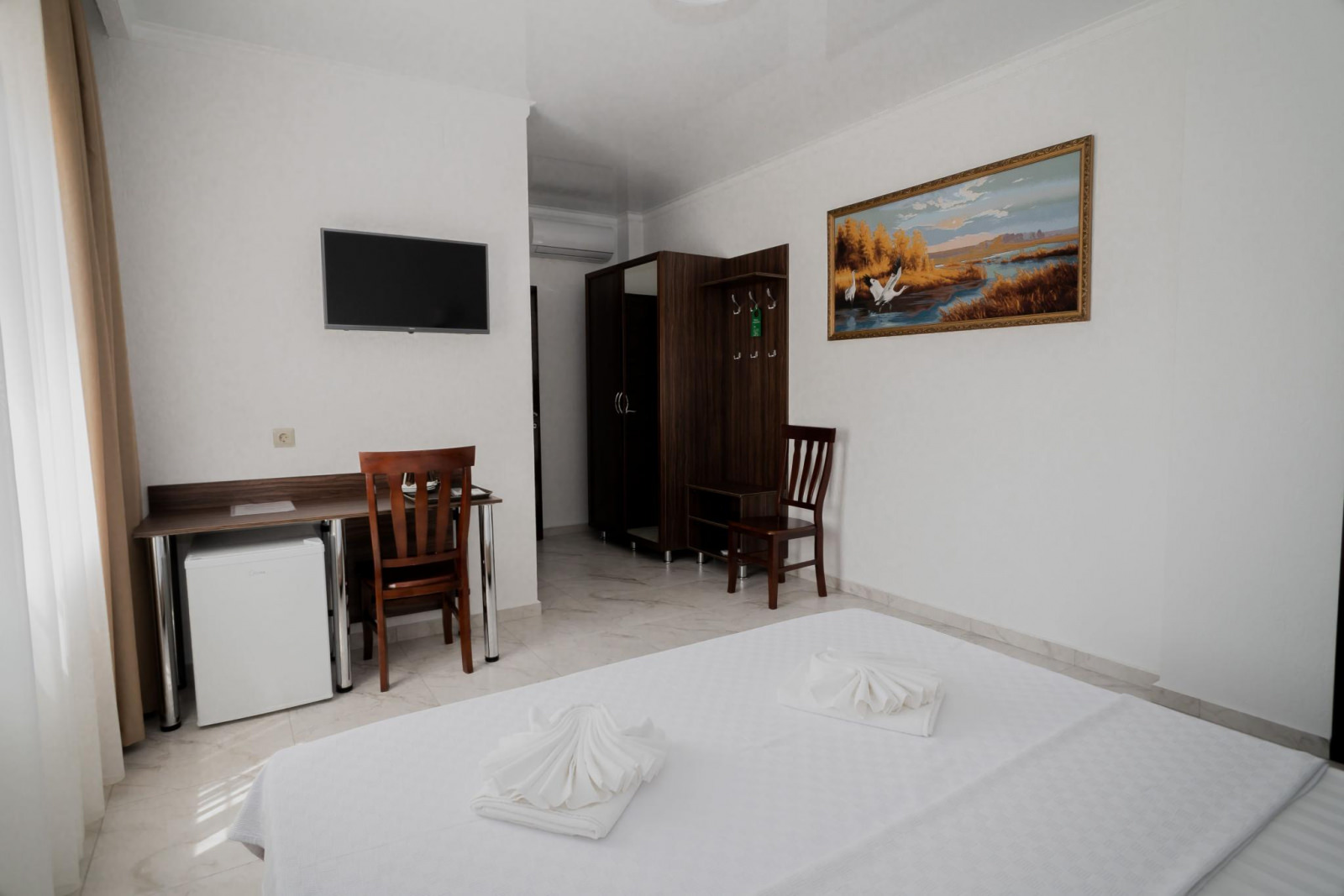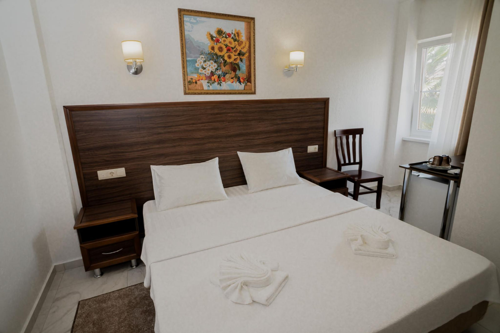 Номера расположены на верхних этажах отеля. Светлые просторные номера. Смежный санузел в номере, кондиционер, холодильник, сейф, банные принадлежности, тапочки, фен, спутниковое TV, WiFi, гладильная на этаже. Площадь: 18кв. м Кровати: больших двуспальных 1