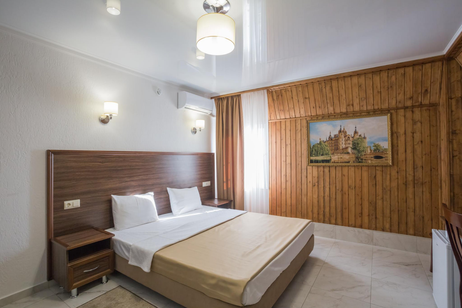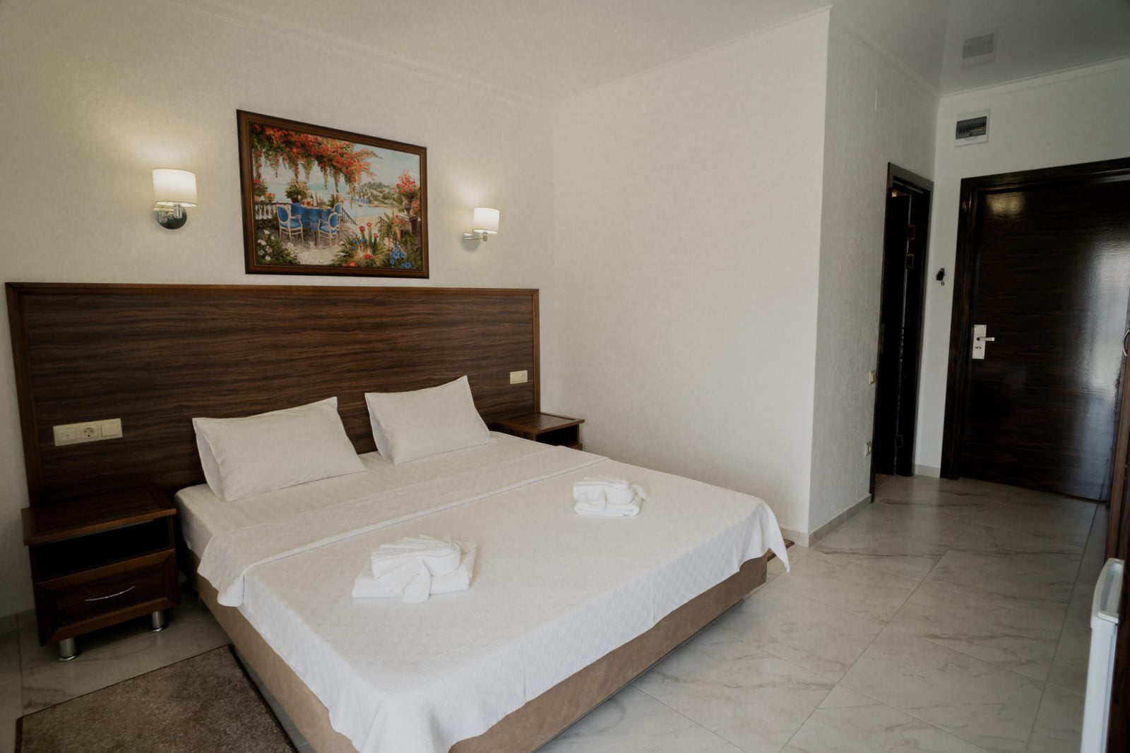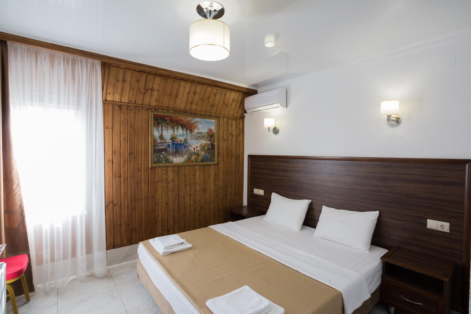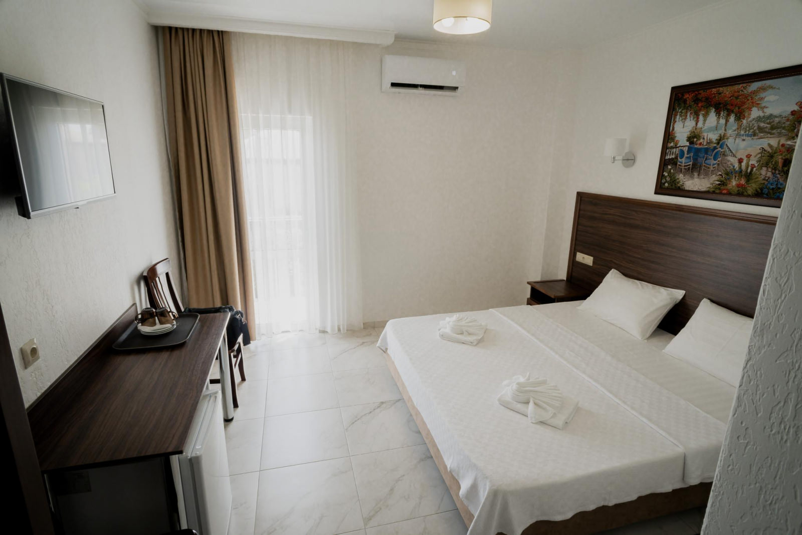 Номера расположены на верхних этажах отеля с видом на море или горы. 2-х местный с возможностью доставить 1 дополнительное место. Смежный санузел в номере, кондиционер, холодильник, сейф, банные принадлежности, тапочки, фен, спутниковое TV, WiFi, сушилка для белья. Площадь: 25 кв. м Кровати: больших двуспальных 1, либо 2 раздельных